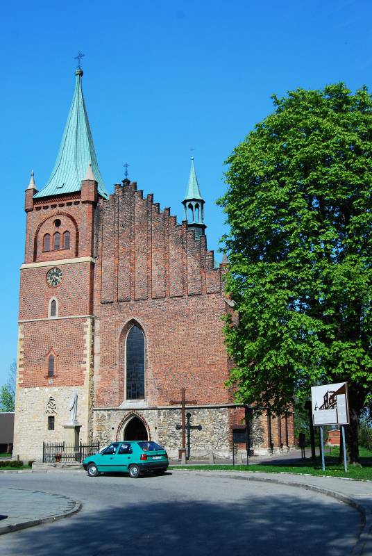 Kościół z 1393 roku w miejscu pierwotnej świątyni romańskiej, wzmiankowanej w 1292 roku. Zabytek klasy I. Gotyk z elementami neogotyku, murowany z cegły, układ polski, w dolnych partiach z kamienia, oszkarpowany. Obok kościoła znajduje się grobowiec w kształcie antycznego sarkofagu należący do księżnej Apolonii Poniatowskiej, właścicielki dóbr zatorskich w XVIII/XIX w.